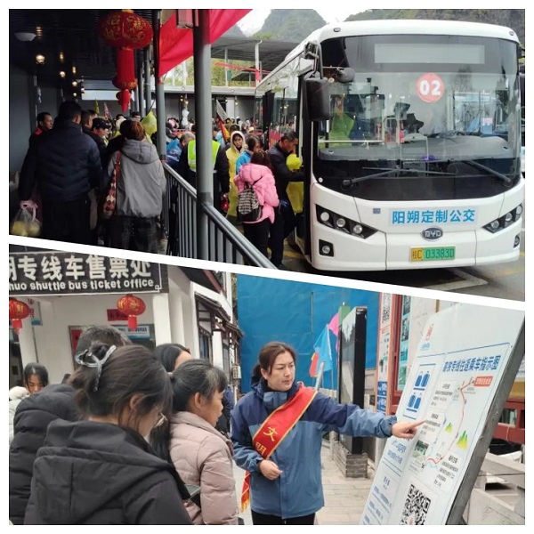 春节期间,阳朔迎来新一波旅游高峰。阳朔山水公司通过强化车辆维护、提升集散中心及场站服务管理等措施,在旅游高峰期间确保乘客安全、准时到达目的地。为确保游客出行顺畅,公司还与遇龙河景区公司紧密沟通,根据游客流量进行灵活调度,春节期间码头无游客滞留;开通兴坪古镇游客免费接驳服务,累计发车1062车次,客运量达71100人次;开通夜间高铁接驳专线,运送游客较同期增长6.8%,优质服务和良好的出行体验赢得了乘客赞誉。