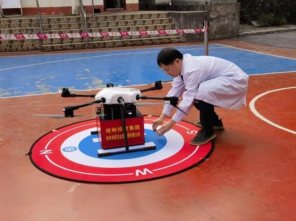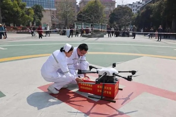 试飞当日,搭载着急需医疗药品的小型无人机从桂林医科大学附属医院乐群院区起飞,分别精准降落至桂林医科大学一附院漓东院区、桂林医科大学二附院指定地点,较传统陆路运输效率提升6倍。