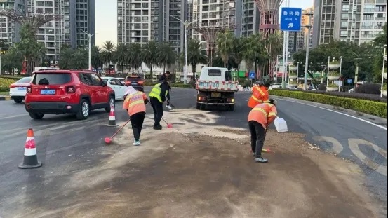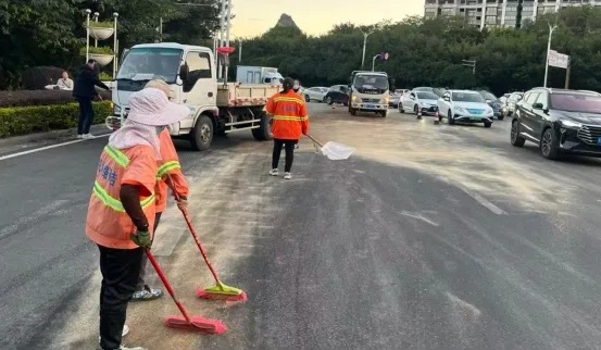 事发当天,接到紧急通知后,机场路公司道路养护中心负责人立即启动应急预案,调度作业人员驾驶装载泥沙的车辆,携带清扫工具、警示标志等设备赶赴现场。抵达现场后,作业人员先在油污区域周边布设警示锥、警示牌引导过往车辆减速避让,再采用铺设泥沙吸附、人工清扫相结合的方式,先用泥沙覆盖油污区域吸附油脂,再用扫帚、铁锹反复清理,确保路面无残留。经过近40分钟的紧张作业,油污被彻底清除,路面恢复干爽,交通秩序迅速恢复正常。