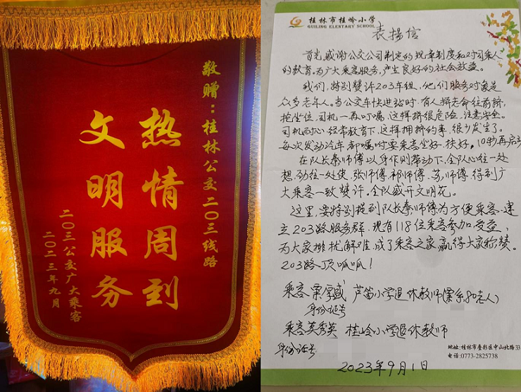 近日,退休教师莫阿姨同她的邻居粟阿姨一起来到桂林公交,把印有“热情周到,文明服务”字样的锦旗送到始发站场站安全服务部值班人员手上。