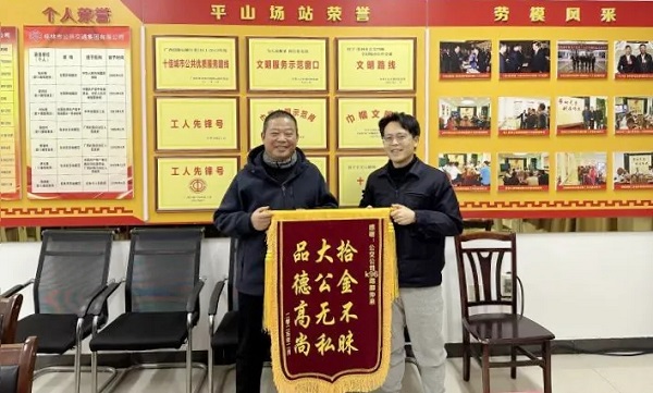 2月10日,平山场站茶店车场办公室内,乘客熊女士送来一面锦旗,表达对驾驶员童小飞的感激之情。“感谢司机师傅拾金不昧,捡到我丢失的钱包还妥善保管。”