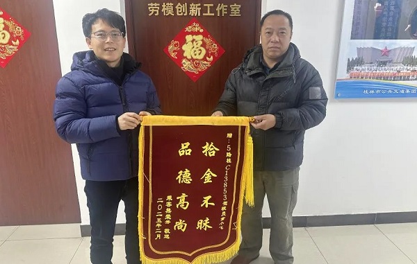 2月13日,市民黄女士将一面写有“拾金不昧大公无私品德高尚”的锦旗送至平山场站,感谢驾驶员郝仲来师傅将自己丈夫遗落在K96路公交车座椅上的钱包和各类证件妥善保管并原物奉还。