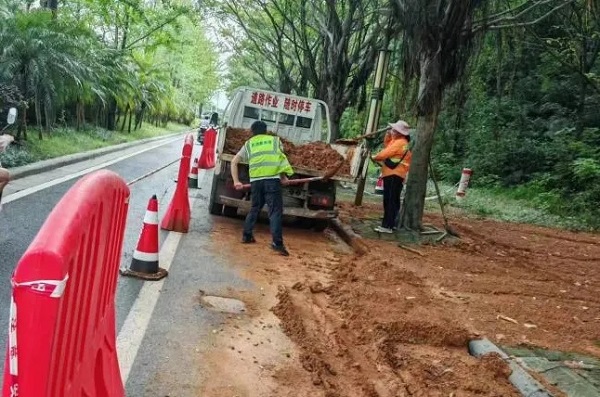 2024年6月,暴雨突袭,机场路部分路段交通中断。谢健荣第一时间跟随养护维修团队开展抢修工作,冒着大雨涉水勘察被洪水阻断的道路情况,制定应急措施,疏导交通……整个雨季,谢健荣和道路养护中心的同事们都在加强日常巡查,同时还持续开展夜间巡查,他们加班加点、不畏艰难、坚守岗位,坚守公路养护第一线。