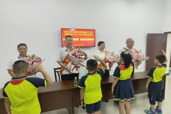 同学们的到来,受到了劳模们的热情欢迎和接待。在二楼会议室,党十九大代表、全国劳动模范夏四初、自治区劳动模范曹春停、胡天顺、“桂林市五一劳动奖章”获得者莫伟平这些桂林交控集团清廉代表们用风趣幽默的话语,向在场的同学们及家长分享了在工作中发生的小故事,讲述了身边的劳动模范事迹,以言传身教展示了清廉企业中优秀共产党员的风采,上了一堂生动的社会实践课。为给同学们树立“劳动最光荣”“清廉树人风”的观念,夏四初立足平凡的公交驾驶员岗位,讲述自己在车厢运行服务过程中总结出的经验方法,与大家共同分享了公交的发展历程,使同学们近距离了解劳动模范的故事,树立做一个奉献正直的人生价值观。听了劳模们的讲述,同学们不时发出一阵阵惊叹,同时一个个踊跃举手提问:“夏四初阿姨,您为什么会选择成为一名公交驾驶员呢?”“胡天顺叔叔,您觉得您在工作中遇到的最大的困难是什么?”“曹伯伯,您觉得正确的人生价值观是什么” ……针对同学们的提问,劳模们也用有趣生动的方式一一回答,会议室不时响起欢声笑语。课堂上,桂林公交的劳模们还与同学们玩起了互动小游戏,在游戏中,让同学们了解在乘坐公交车时,哪些现象是不文明的,哪些东西是禁止携带的,在轻松活跃的环境中达到了寓教于乐的效果。劳模鼓励同学们要自觉传承和弘扬雷锋精神,做一个清廉正直的人,树立为民服务意识,把爱心传递给社会有需要的人群。下课后,同学们向劳模们献上了鲜花,大家纷纷表示,要以劳模叔叔阿姨为榜样,热爱祖国、热爱劳动,从小树立一个正确人生观,通过劳动和磨炼意志、清廉友爱,长大后做对祖国建设有用的人才。
